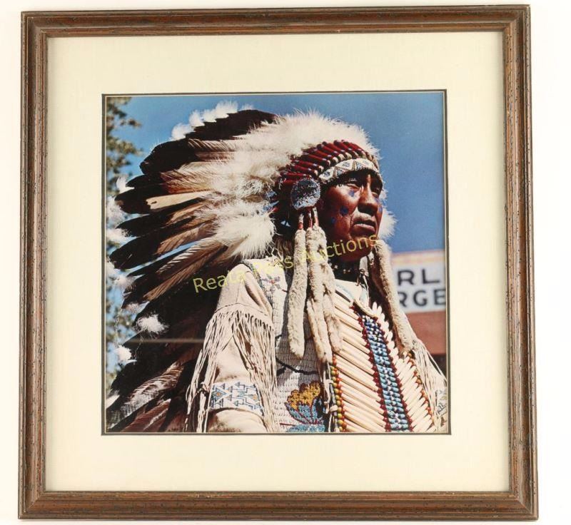 Color photo of upper torso of Chief in full headdress and costume. Double mat and wood frame. Image measures 14 3/4"x14 3/4".