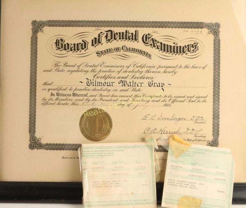 Including; framed certificate from the college of dentistry, award from California State Dentistry Assoc, Board of Examiner's Certificate-CA, and a desk name plate all from Dr. Gilmour W Gray.