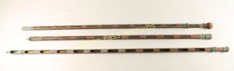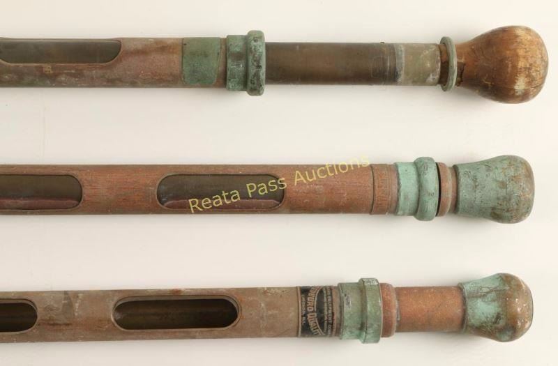 All are bronze and brass construction including; (1) Seedburo grain/seed probe sampler with 12 slots measuring 70 1/2" long. (1) Burrows Manufacturing 10 slot tester measuring 59 1/2" long and (1) unmarked with 10 slots, a wood top, and flat end measuring 61 1/2" long. The design allows you to turn the top knob, line up the inner and outer slots into the open position, and dip into grain or seeds. Slots are open to let grain enter. Then you turn the knob again, closing slots to capture the grain and pull the sample out. It is precision made to have a nice snug fit between the inner and outer tubes. All three have a great patina the way they are They could be easily polished to a full brassy shine if desired.