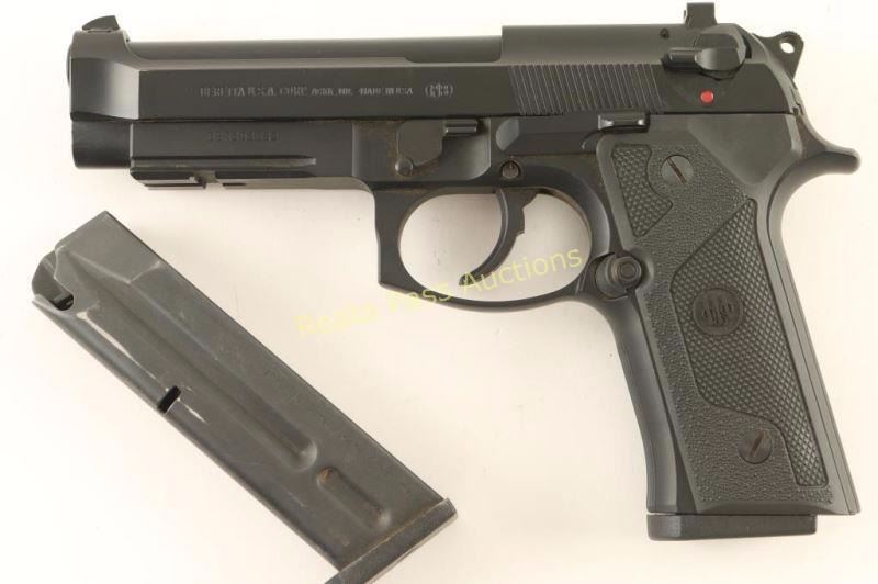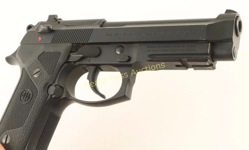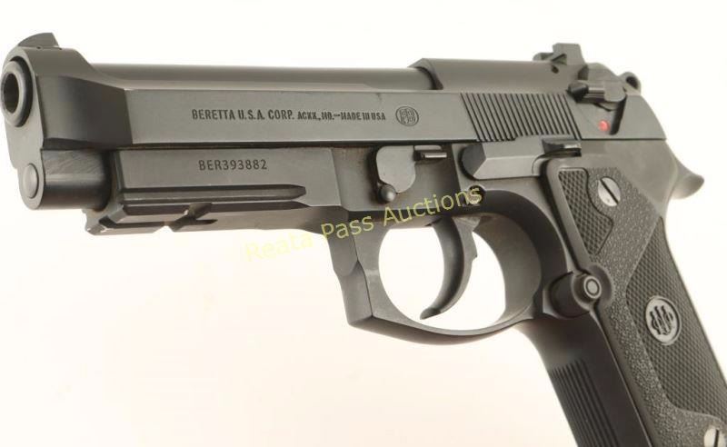 U.S. made double-action semi automatic pistol chambered in 9mm Parabellum. Features a matte black finish, 4.65" black coated stainless steel barrel, serrated slide, removable three-dot sights, ambidextrous decocker, serrated grip straps, factory 10 round magazine, smooth trigger, integral accessory rail on the frame, serrated round hammer spur and two-piece Beretta checkered black plastic grips. Includes a factory hard case with extra magazine. Pistol exhibits approximately 97% of it's original finish showing light edge wear and a few other small scattered losses. Action is less than smooth, bore is excellent, and grips are fine. In need of a good cleaning. Condition is near excellent in box. ***Modern Firearm***