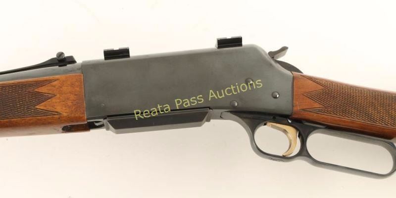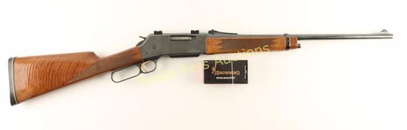 Japanese made lever-action repeating rifle chambered in .22-250 Remington. Features a bright blued finish, 20" tapered barrel, ramped blade front sight with brass bead, adjustable rear sporting sight, installed scope bases, serrated gold trigger, serrated wide hammer spur, detachable magazine, high gloss checkered walnut forend and straight grip shoulder stock with factory recoil pad. Includes an extra 4 round factory magazine in the box. Rifle exhibits approximately 97% of it's original finish showing only light use. Action is smooth, bore is excellent and wood stock are very good with some small imperfections. Condition is very good+. ***Modern Firearm***