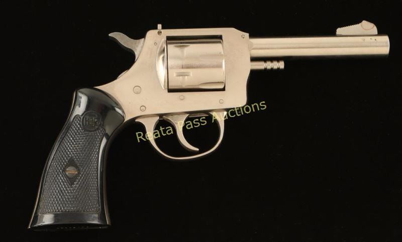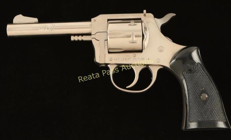 SN: AX171325 Vintage double-action revolver chambered in .32 Smith & Wesson Long, circa 1981. Features a nickel plated finish, 4" pinned barrel, blade front sight, windage adjustable rear window sight, solid frame with square butt, fluted six-shot cylinder, smooth trigger, serrated hammer spur, transfer bar safety and two-piece H&R checkered black plastic grips. Revolver exhibits fine superficial scratches throughout giving it a brushed appearance and shows a few small losses on the barrel & grip straps with approximately 97% finish intact overall. Action is crisp with good lock-up, bore is very good and plastic grips are near fine. Condition is very good. ***Modern Firearm***