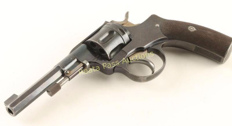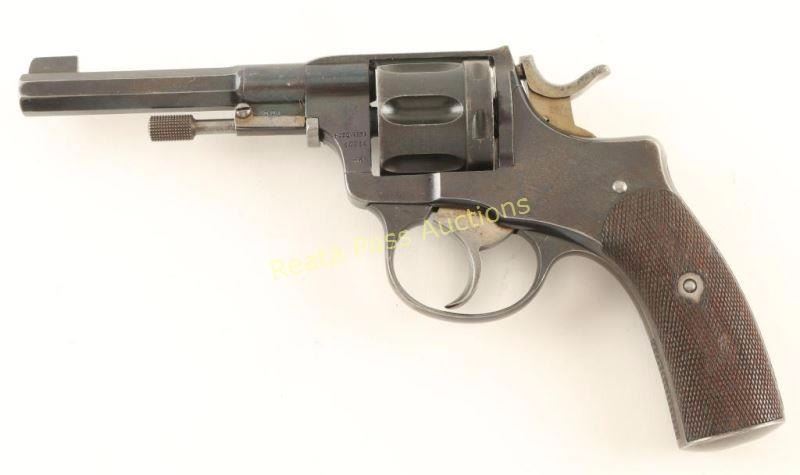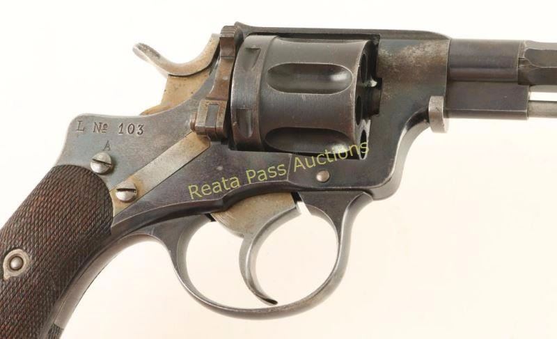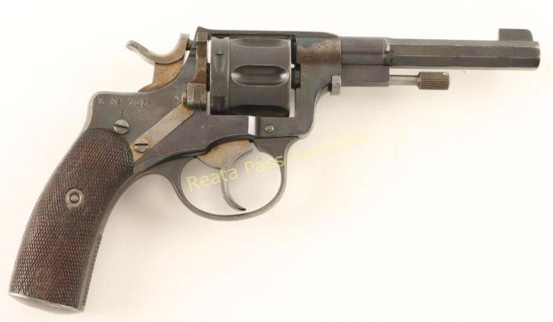Swedish military double action revolver chambered in 7.5mm Nagant, circa 1900's. Features a blued finish, 4.5" half octagonal barrel, blade front sight, v-notched rear sight, swing out ejector rod, fluted six-shot cylinder, straw colored hammer, trigger & loading gate, no lanyard ring and checkered walnut grips. All serial numbers are matching other than the cylinder and the frame is marked "L No 130 A." Revolver exhibits approximately 60% of its blued finish showing light holster wear and overall thinning. Straw colors are approximately 60% intact as well. Action is strong, bore is very good and wood stocks are good with semi-smooth checkering & a few small dents. Condition is good+. ***C&R Firearm*** ***Modern Firearm***