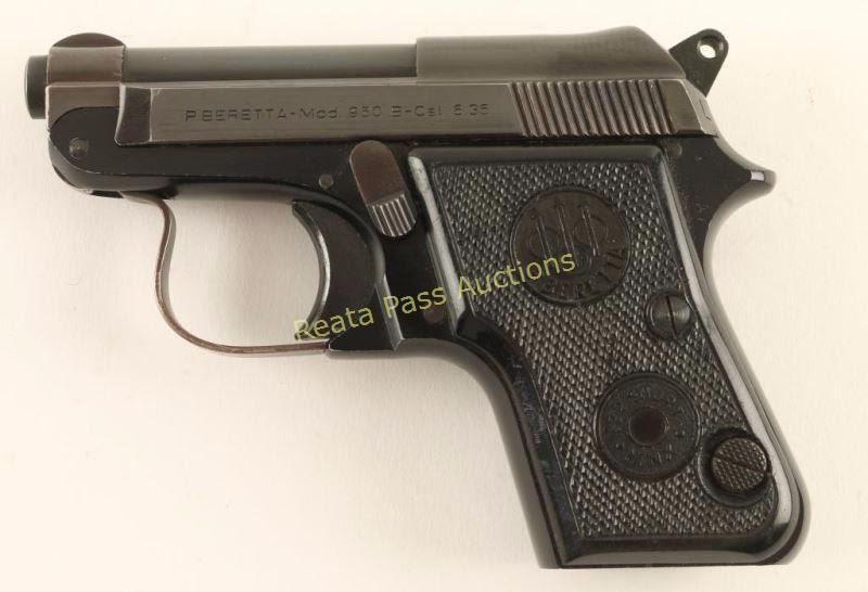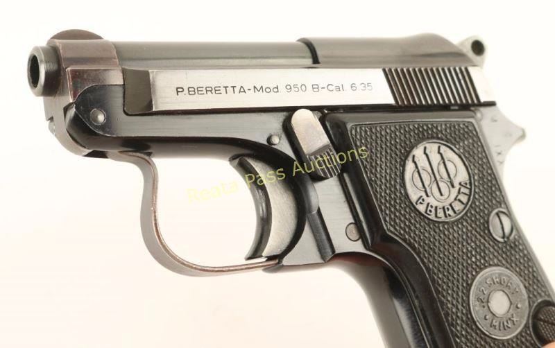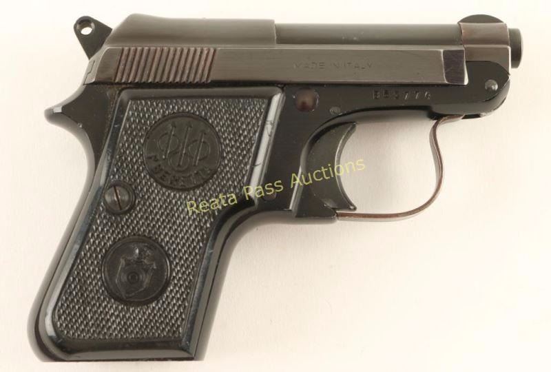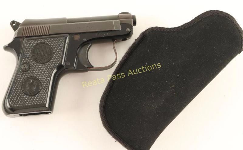 Italian made single action semi-automatic pocket pistol chambered in 6.35mm, circa 1965. Features a blued finish, 2.4" tip-up barrel, serrated slide, fixed sights, smooth trigger, serrated round hammer spur, push button magazine release, no magazine and two piece Beretta checkered black plastic grips for a '.22 Short Minx.' Includes a Blackhawk size 4 clip holster. Pistol exhibits approximately 92% of it's blued finish showing some light edge wear, handling marks and the slide turning slightly plum. Action is tight, bore is very good+ and grips near fine. Condition is very good. ***Modern Firearm***