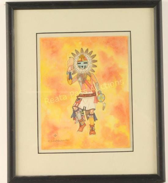 Depicting a sunface Kachina. Image measures 9"x7" in double mat with black wood frame.