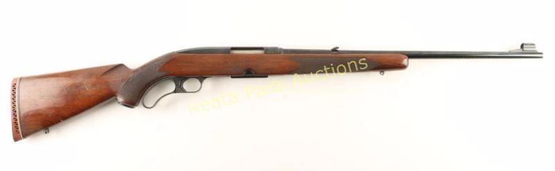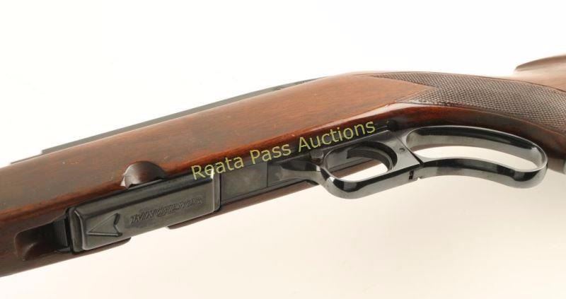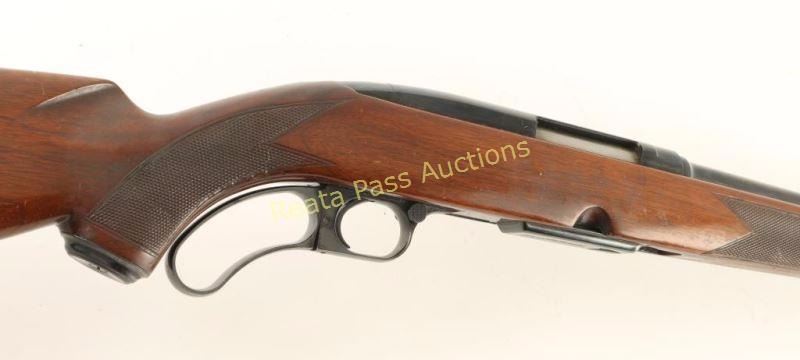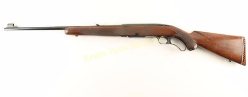 Magazine fed lever action sporting rifle chambered in .234 Winchester, circa 1957. Features a high polish blued finish, 22" barrel, ramped & hooded blade front sight, adjustable folding leaf rear sight, drilled & tapped receiver, detachable 4 round magazine, serrated trigger, push button safety, swivel studs, and checkered walnut one piece pistol grip shoulder stock with aftermarket recoil pad. Rifle retains approximately 97% of it's original blued finish showing light handling marks and little wear. Action is smooth, bore is excellent, and wood stock is good with scattered finish loss from wear & moderate blemishes. Condition is very good. ***C&R Firearm*** ***Modern Firearm***