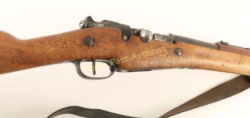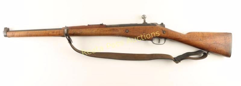 'Turkish Forest Service' Modified French military clip-fed bolt action service rifle chambered in 8x50Rmm. This rifle was modified under the order of the Turkish government and issues to the forestry division to protect their walnut trees. It features a blued finish, 22" barrel, winged blade front sight, graduated rear sight, bent bolt handle, black leather sling, smooth wood handguard and full-length shoulder stock with straight grip & metal buttplate. The receiver ring is marked "T C/ORMAN/1948." Rifle exhibits an even dark grey patina with a lighter brown patina on the exposed portion of the barrel behind the rear sight. Action is smooth, bore is dark with good rifling and wood stock is good with a small crack extending from the triggerguard on the wrist. Condition is good+. ***C&R Firearm*** ***Modern Firearm***