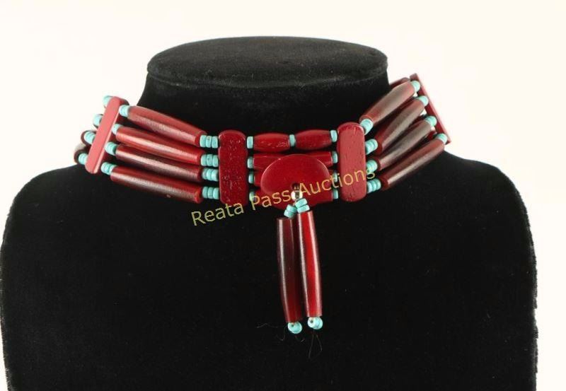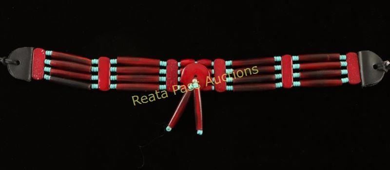 This Indian turquoise four strand bone choker is ideal for a guy or gal that's ready to step out for the night....Native style! Dine' Shirley Wiley stained & strung these. The red hair-pipe tubes, spacer slabs & medallion with dangles are accented with genuine turquoise wheel beads. About 1-1/8" tall & about 13" from tab to tab, the leather ties add an additional 7" on each end.