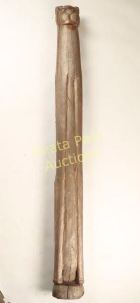 Carved head on skinny log. Measures 78"h x 6 1/2"dia.