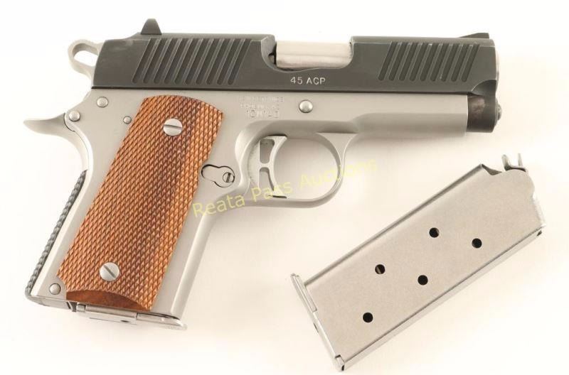 Innovative compact single-action semi automatic pistol chambered in .45 Automatic, produced in Phoenix, Arizona. Detonics pistols have a long and interesting history revolving around the compact 1911 format. Features a matte blued slide with front & rear slide serrations, 3.5" barrel, ramped front sight, dovetailed rear window sight, smooth trigger, skeletonized hammer, thumb safety, extended push button magazine release, 6 round magazine, checkered mainspring housing, steel frame with beavertail and two-piece checkered wood grips. Includes an extra factory magazine. Pistol exhibits approximately 96% of it's blued finish showing light edge wear and few scuffs. Action is crisp, bore is excellent and wood grips are fine. Condition is near excellent. ***Modern Firearm***