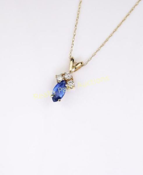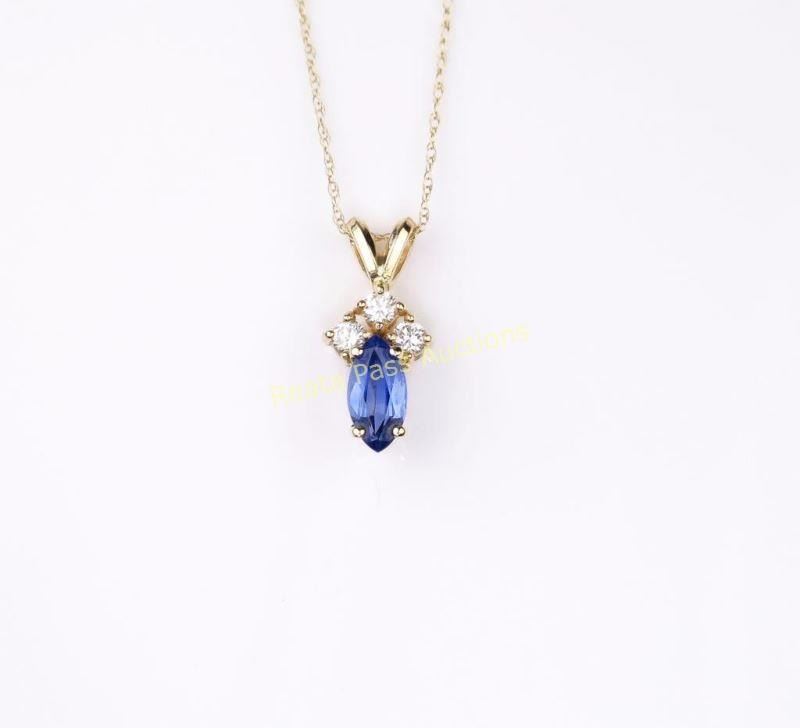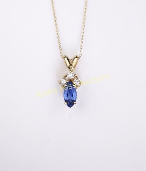 Set with a fine MQ cut Ceylon sapphire weighing approx. 1.00 carat and three ‘IDEAL’ cut diamonds weighing approx. 0.35 carats of G-H colors and VVS/VS clarity set in14 karat yellow gold . Retail $2,000-$3,000 Nice
