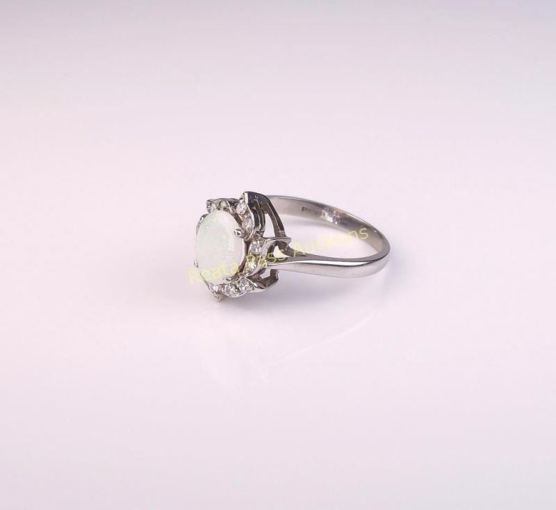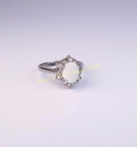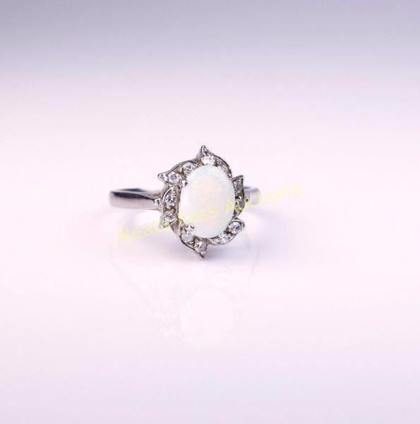 Set with an Australian Opal weighing approx. 2.00 carats and surrounded by 12 round diamonds weighing approx. 0.25 carats of F-G colors and VS clarity set in a 10 karat white gold setting. Retail $1,500-$2,000