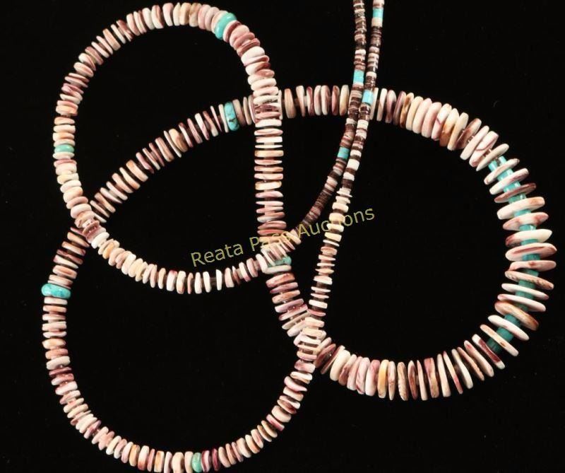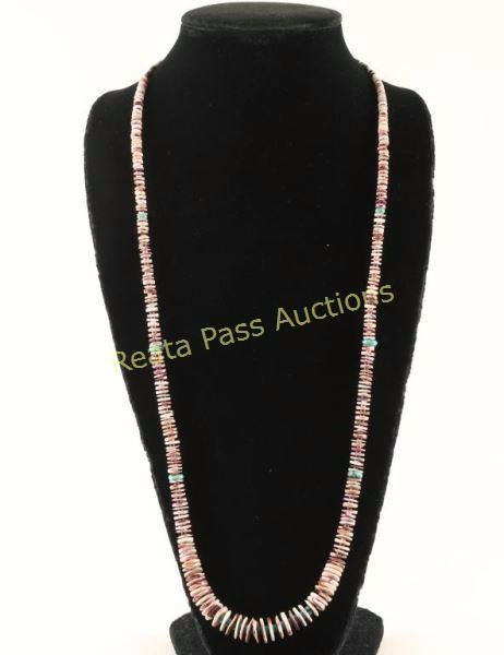 Designed and strung by Navajo Berlinda Begay. Genuine spiny oyster beads have been strung in graduated sizes with genuine turquoise and genuine olive shell heishi spacers. Measures 34 1/4" long.