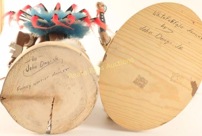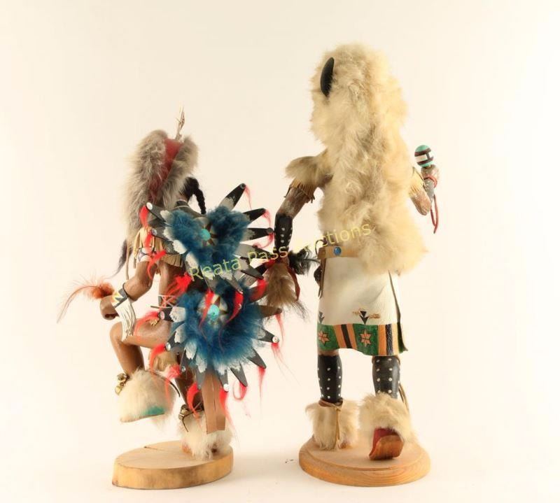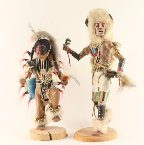 Wood construction and hand painted with fur, shell, feather, leather and jingle bell accents. White Buffalo Dancer measures 19 1/2" and Fancy Warrior Dancer measures 16" tall.