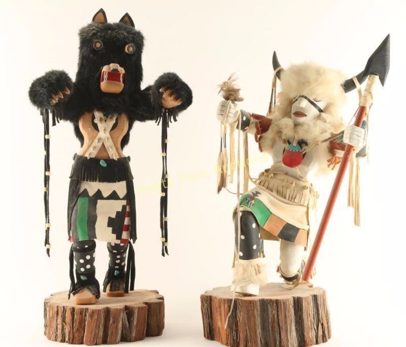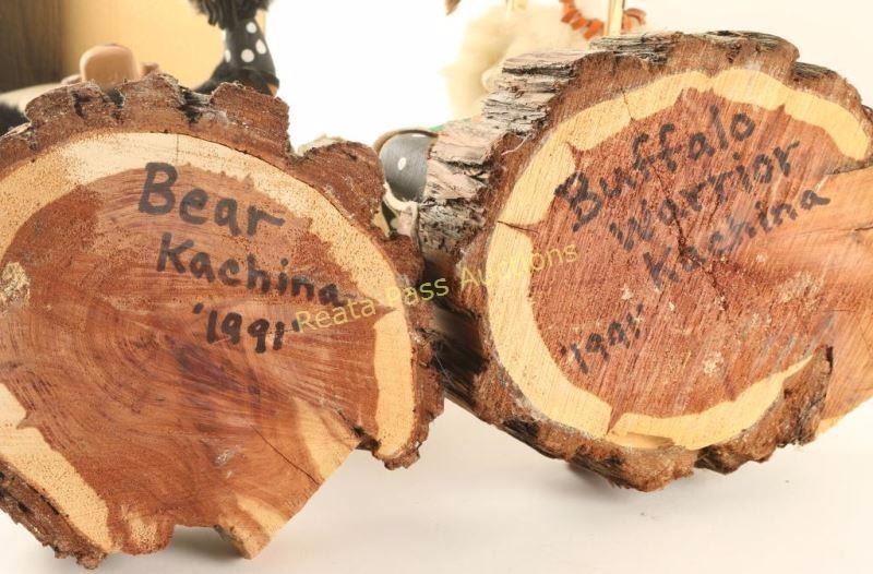 Wood construction and hand painted with fur, shell, feather, bead and leather accents. Bear Kachina measures 23" tall and Buffalo Warrior measures 20" tall.
