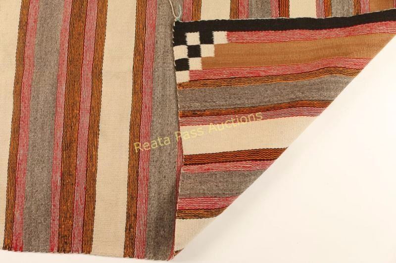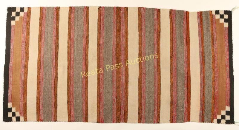 Stripes in black, orange, red, gray and white. Rug is finished off with black and white checkerboard corners. Good condition. Measures 60"x29".