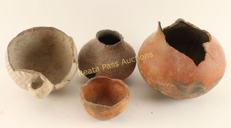 Relic condition textured pot with piece missing from bottom, intact small scalloped edge bowl with leaf motif, terra cotta pot with top half broken off, and one handle pot with painted geometric design that is half missing.