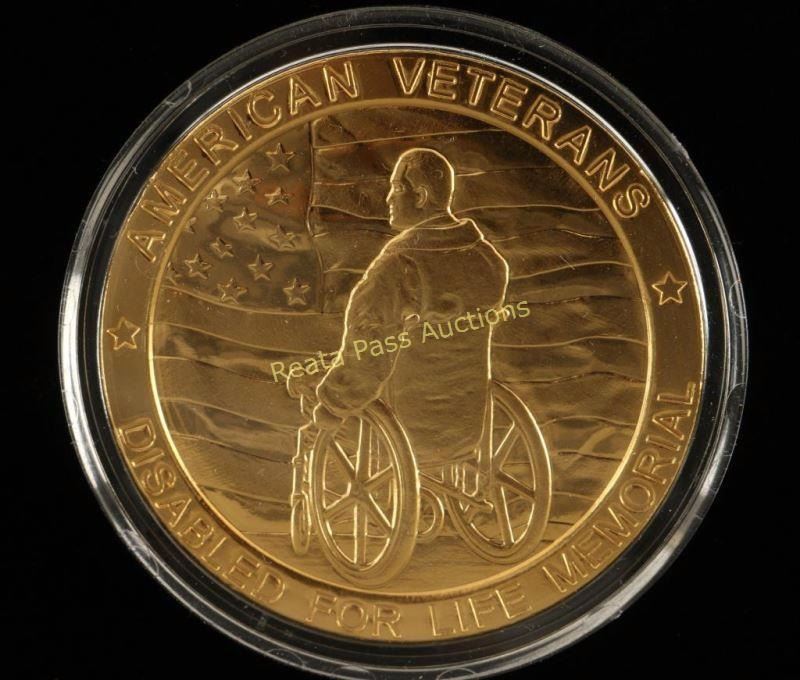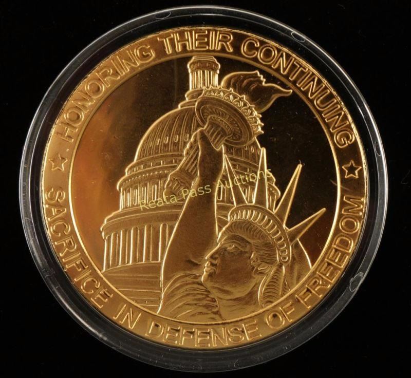 Commemorative coin, reads "Honoring their continuing sacrifice in defense of freedom" Shows veteran in wheelchair with American flag. On other side shows Statue of Liberty, in box. Gold color possibly gold plated.