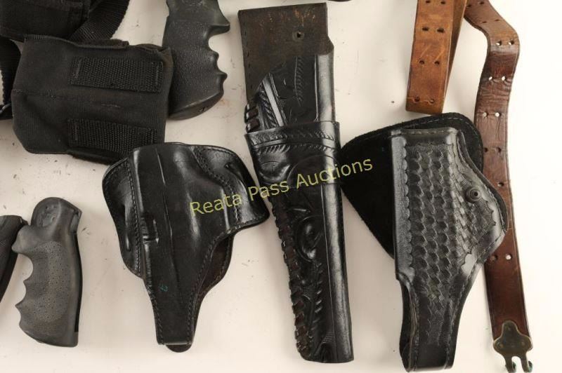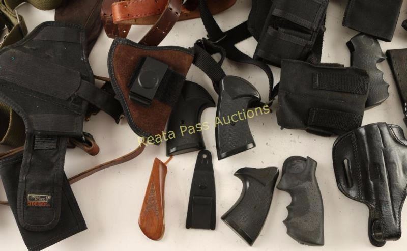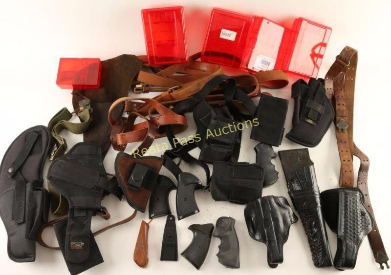 Box of misc. slings, holsters, grips, and die boxes.