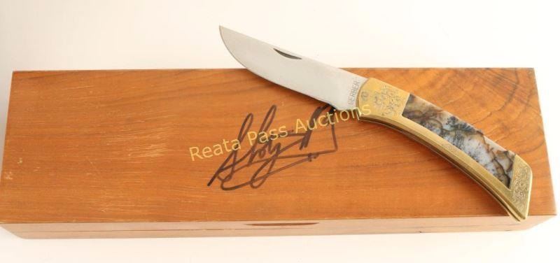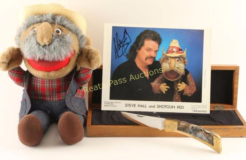 with engraved brass frame and green jade inlays. This knife was purchased from Steve Hall at his home in Nashville. He was known as a ventriloquist who operated a doll named 'Shotgun Red'. To do this he sat under a desk on the Ralph Emery TV show for about ten years during the 1950s. He included a signed picture and a replica doll. He also autographed the knife case. He indicated a second copy of this knife was owned by his good friend Johnny Cash. Knife measures 9" long overall with a 4" blade in wooden felt lined autographed 'Shotgun Red' presentation case. Comes with photo and doll.
