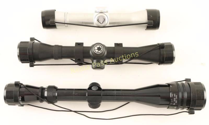 (1) Tasco 4-16x 40mm scope with glossy black finish in good+ condition, (1) Barska fixed power scope with matte black finish & partial rings in very good condition & (1) Bushnell 2x 32mm extended eye relief scope with satin silver finish in very good condition.