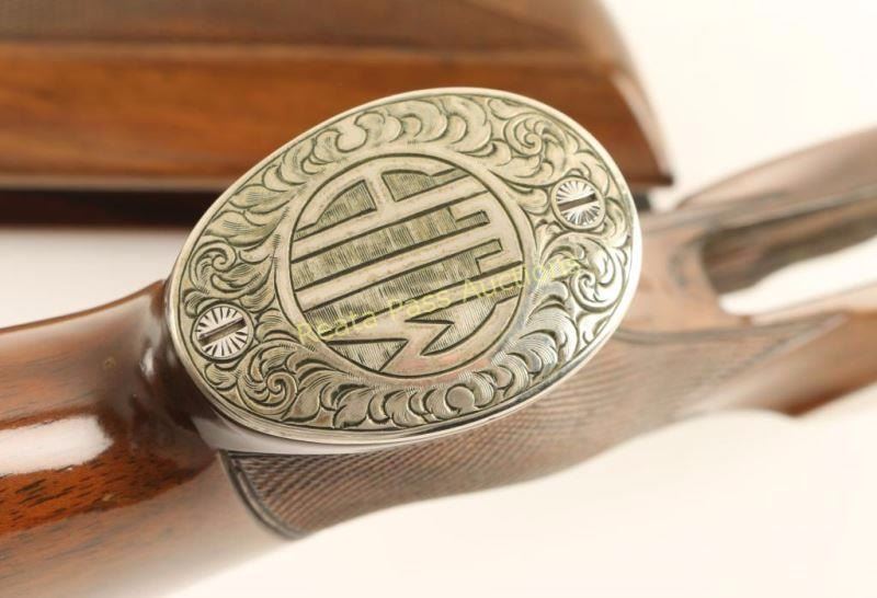 Stock is walnut with hand checkering with an engraved monogrammed 'HTW' and rubber buttplate. Forend is matching, however it has chips to the wood at the release area.