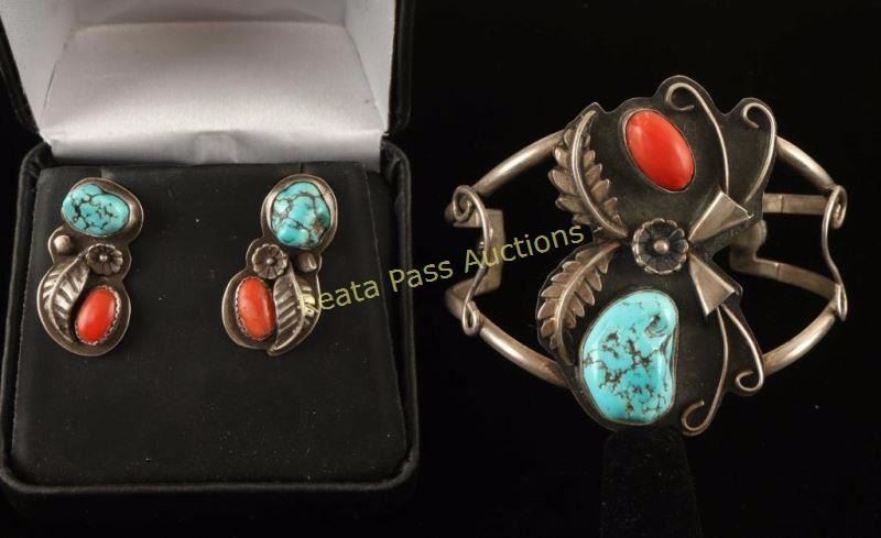 Earrings and cuff artist signed 'P'. Both are very well made by a master silversmith. All done in sterling silver with turquoise and coral. Accented with great applique work showing leaves, tendrils, cactus flowers. All are halllmarked with the artist's script 'P'. Earrings are for pierced ears, cuff will fit most wrists.