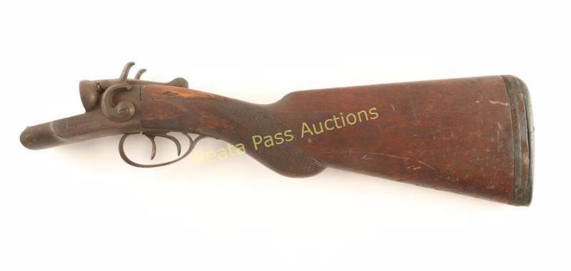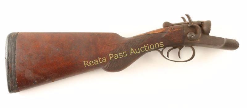 Double barrel side-by-side shotgun receiver with exposed hammers, double triggers, checkered top lever and semi-pistol grip wood shoulder stock with extensions and factory buttplate. Action performs well. Condition is poor. ***C&R Firearm*** ***Modern Firearm***