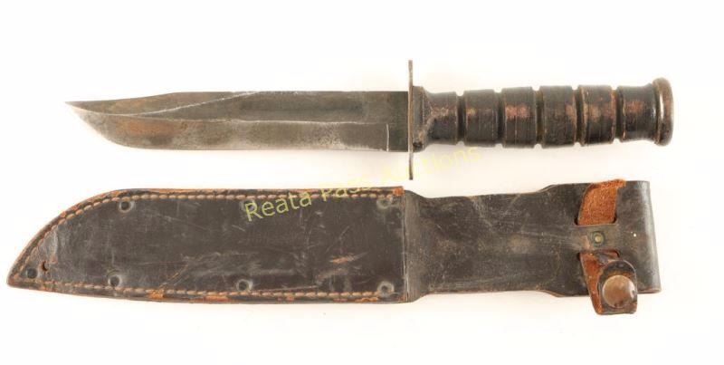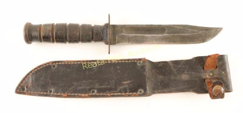 Marked 'U.S. Camillus, N.Y.' measures 12" long with a 6 3/4" blade. Comes in leather sheath. Both show age and use.