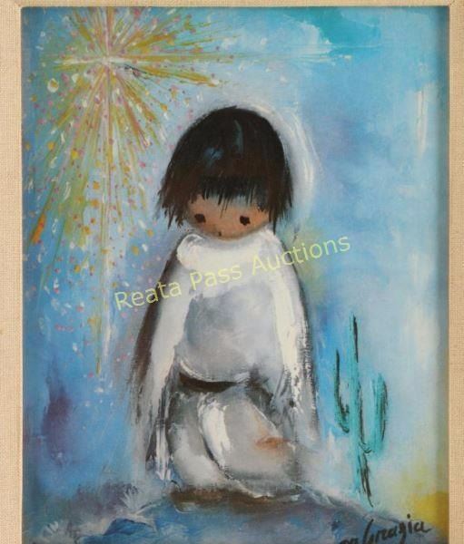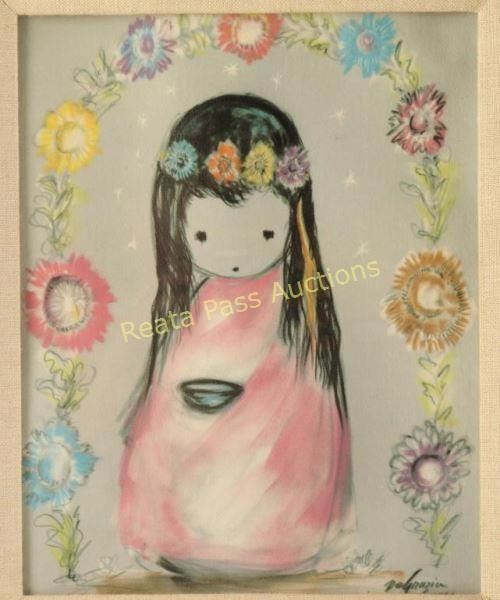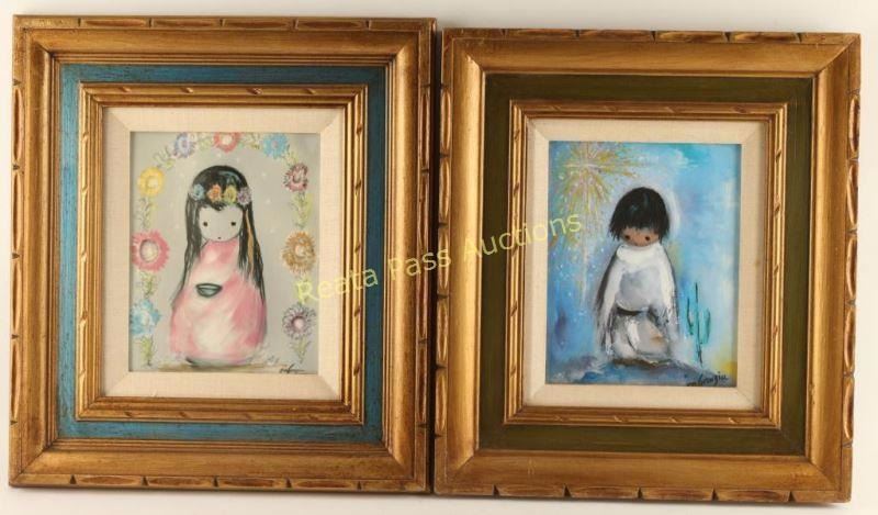 Noted Indian artist DeGrazia, one depicts a boy, one a girl, 8"x10" in gold and turquoise frames.