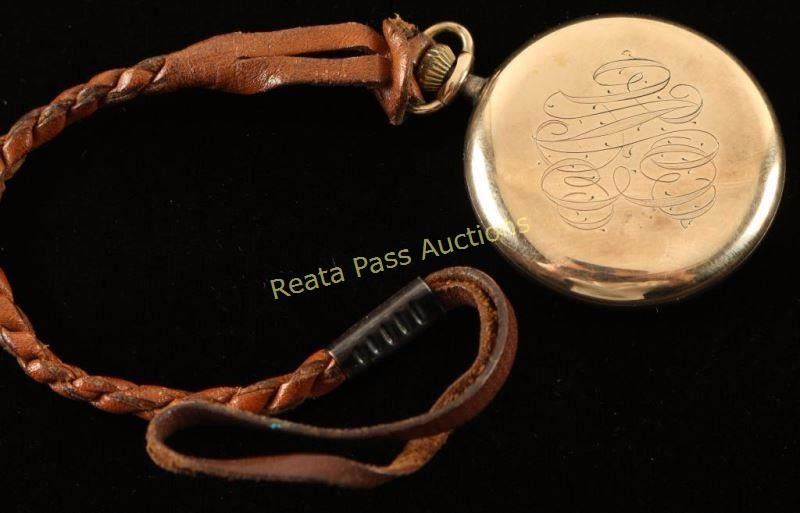 Gold case with 'EAH' monogram, comes with braided leather strap. Not in working condition.
