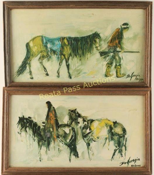1 depicting Native American leading his horse and the other of a female on horseback leading another horse behind her. Both have signatures 'DeGrazia Arizona' lower right and are in wood frames. Images measure 17 1/4"x9 1/4". 'Ettore "Ted" DeGrazia was an American impressionist, painter, sculptor, composer, actor, director, designer, architect, jeweler, and lithographer. Described as "the world's most reproduced artist", DeGrazia is known for his colorful images of Native American children of the American Southwest and other Western scenes. DeGrazia also painted several series of exhibitions like the Papago Legends, Padre Kino, and Cabeza de Vaca' -from Wikipedia.