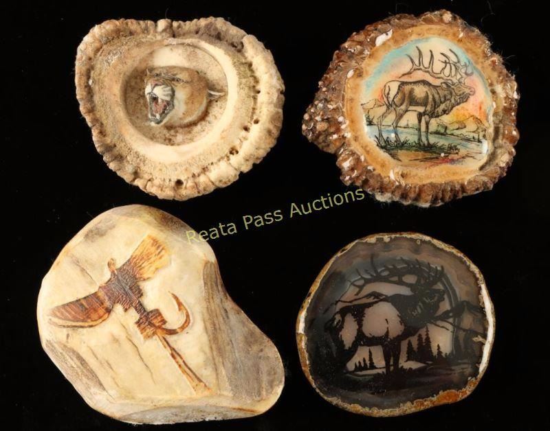 Antler buckle with elk design, antler buckle with mountain lion, antler piece with fish hook design, and a rock buckle with painted elk.