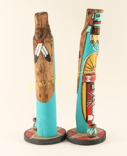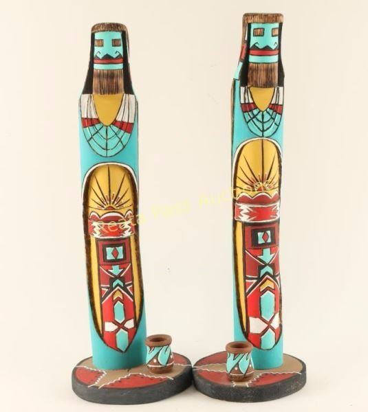 Shalako Lohghail kachinas. Wood construction, hand painted in bright colors with sun, clouds and geometric designs. Signed by artist Gene Belin on bottom. Measures 16 3/4"h x 5"dia.