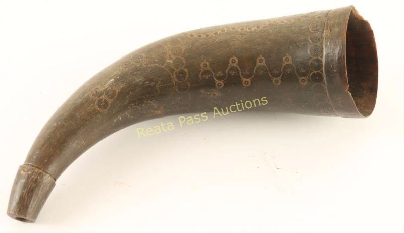 Possibly buffalo horn, 19th century type, shows bear and snake design. Good condition circa 1820-1860. Fur trade era, small chip to rim of mouth. Measures approx. 9".