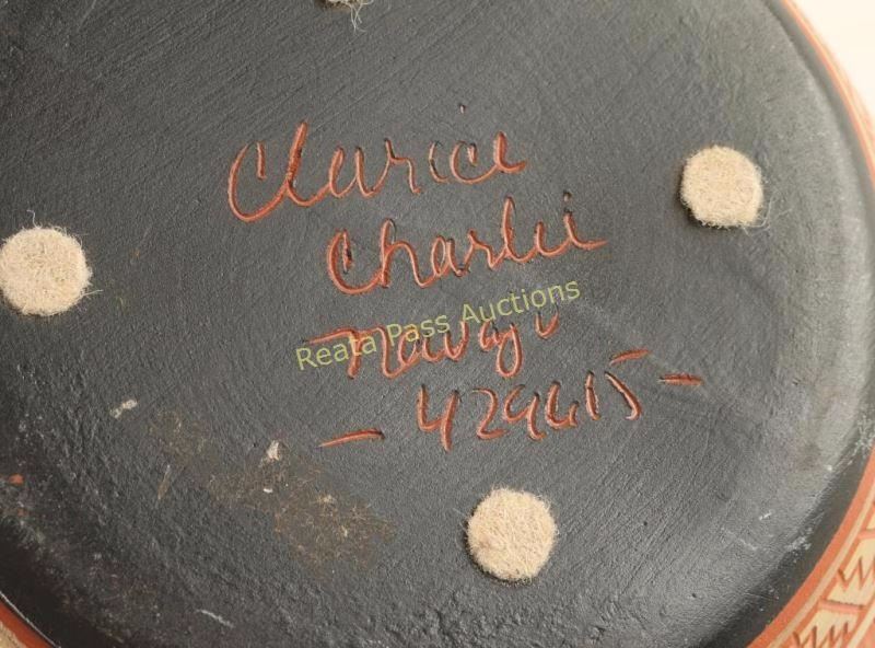 Terra cotta with a black rim and sage and lavender accents. Carved with feather and geometric designs. Signed 'Clarice Charlie Navajo 424615' Measures 8 1/2"h x 8"dia.