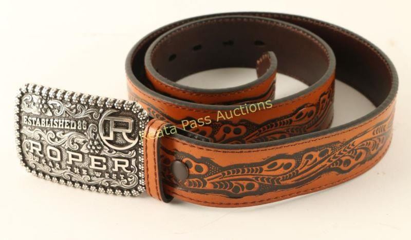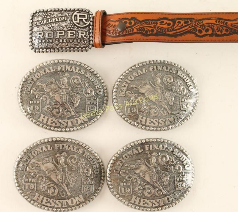 4 'National Finals Rodeo NFR 1984 Hesston' buckles with rider on bucking bronc, still in original packaging. Also included is an 'Established 86 Roper Wear the West' buckle with a small 1 1/4"w saddle tan stamped belt-size 26-28.