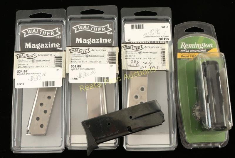 Including (3) Stainless steel Walther 6 round PPK .380 caliber magazines, (1) Remington 4 round 750 or 7400 magazine for .30-06, .270 Win, 35 Whelen or .280 Rem & (1) Meggar magazine marked KTP40-.40 S&W