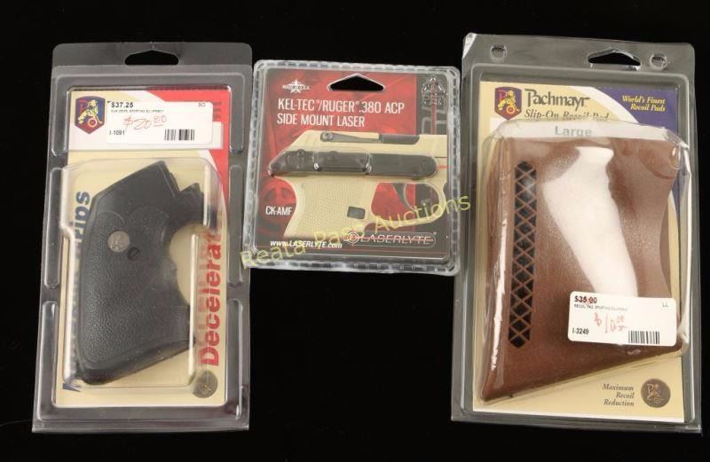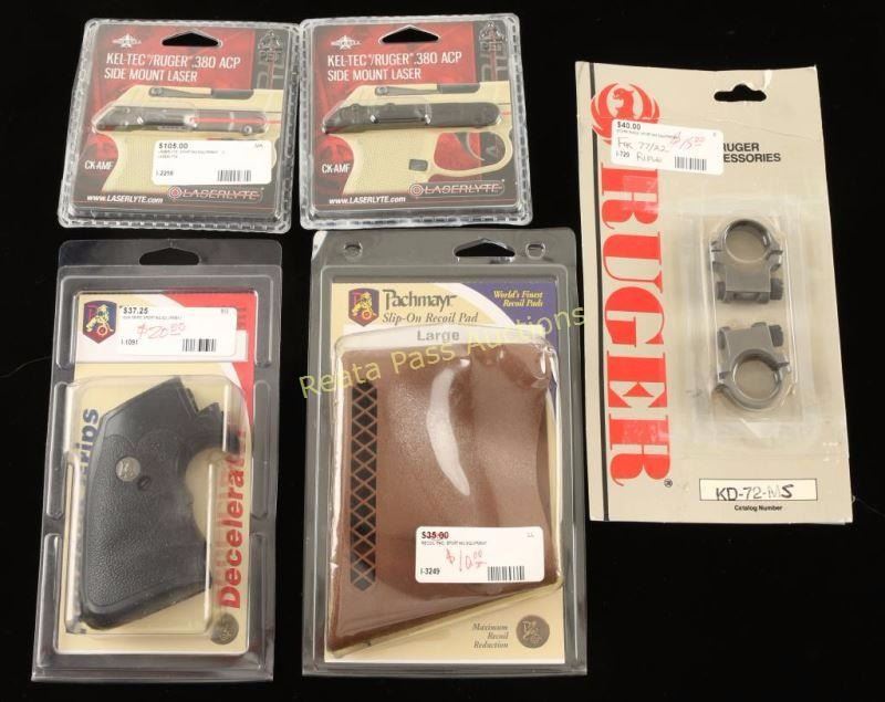 Includes (1) Set of factory bases for the Ruger 77/22 rifle, (1) Pair of Pachmayr Decelerator grips for the Ruger Super Blackhawk revolver, (1) Large Pachmayr slip-on recoil pad & (1) Laserlyte side mount laser for Ket-Tec/Ruger .380 pistols.