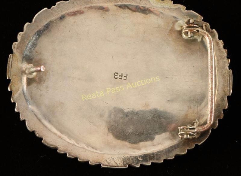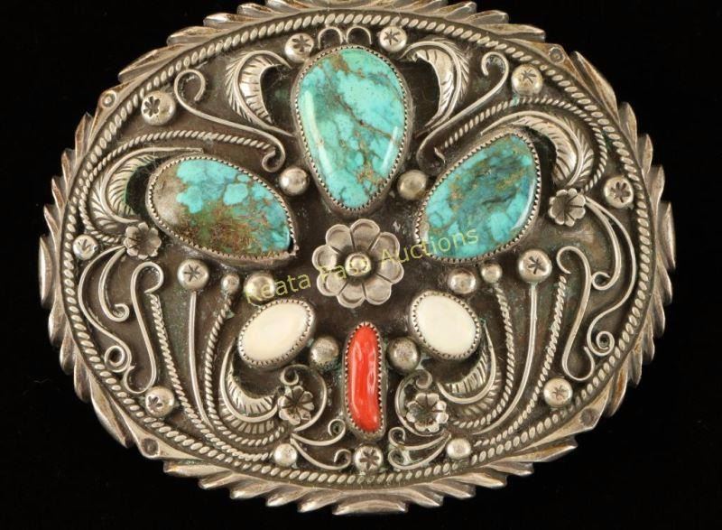 Three inlaid turquoise cabs, also inlaid with coral and mother of pearl. 'FPV' silversmith mark.