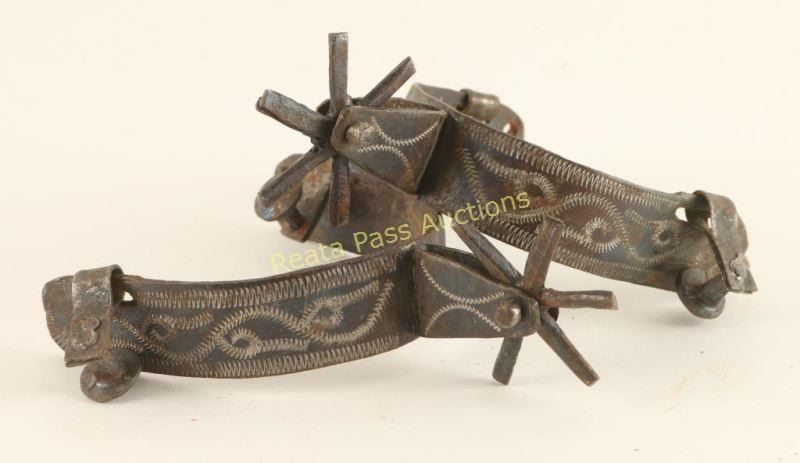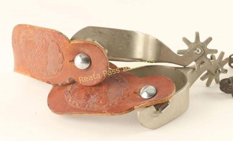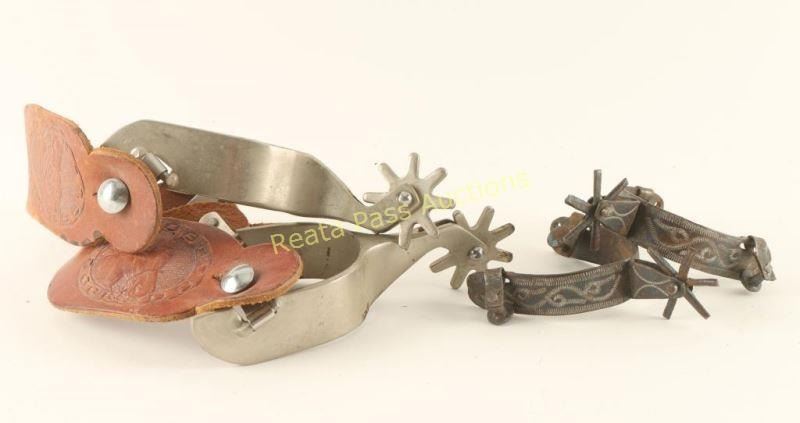 Including 2 pairs of spurs, one plain aluminum with brown leather straps tooled with horse's heads and one small pair etched with a rope design.