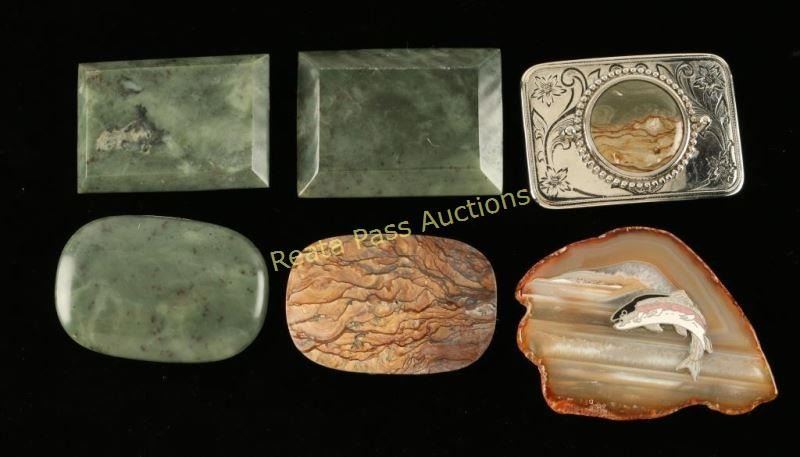 Three of which are green stone, one brown stone with a bass design, and one is a nickeled square with green and brown stone accents.