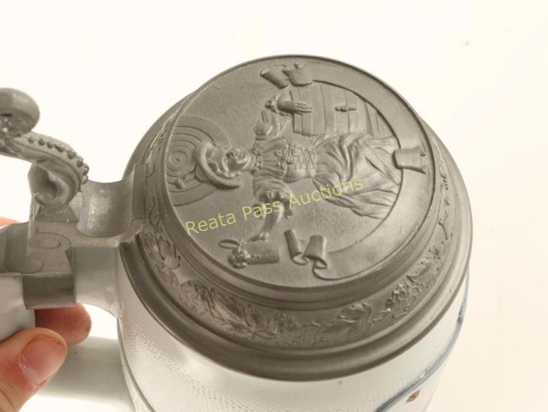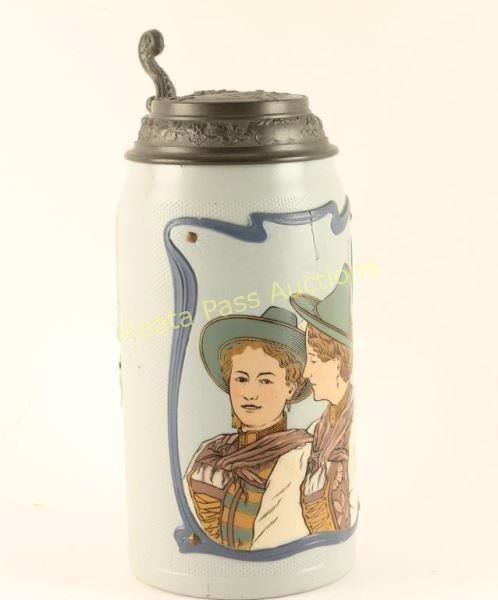 Nice scene of two German ladies with a pewter lid. Stamped 'Metlach' on base. Has a 2" crack on one side and crack inside where handle is attached.
