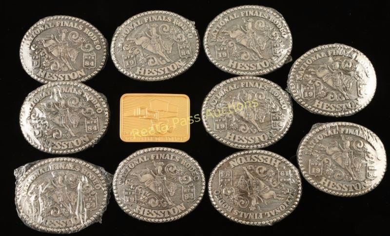 9 'National Finals Rodeo 1984 Hesston' silver metal ovals with rope trim and a cowboy on a bucking bronco in the middle. 1 Brass John Deere commemorative buckle for 'The manufacturing of the one millionth Max Emerge Planter Row Unit, numbered 1875' dated 1984. Comes in black velvet lined box.