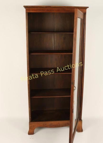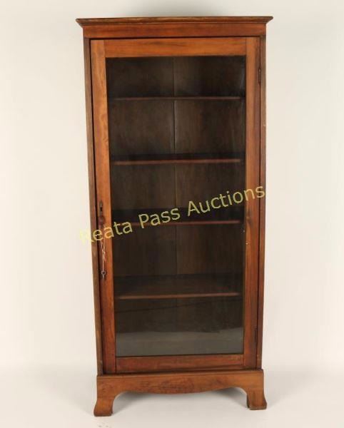 Dark stained wood with 4 shelves and a glass door with key. Measures 52"x24"x12",