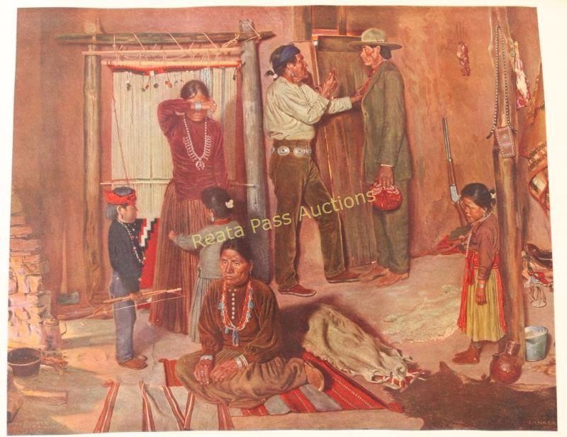 Depicting family scene with two men discussing business at the door in Navajo adobe. Signed 'Ganado' lower right and 'Copyrighted F.A. Burbank 1911' lower left. Image measures 15"x12". Prints only, unframed.