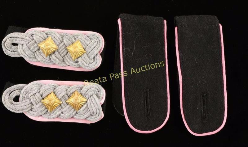 Four shoulder boards for Nazi panzer members. 2 are black with bright pink piping and 2 are black with bright pink piping, silver gray frog and two pips on each. No guarantee of authenticity.