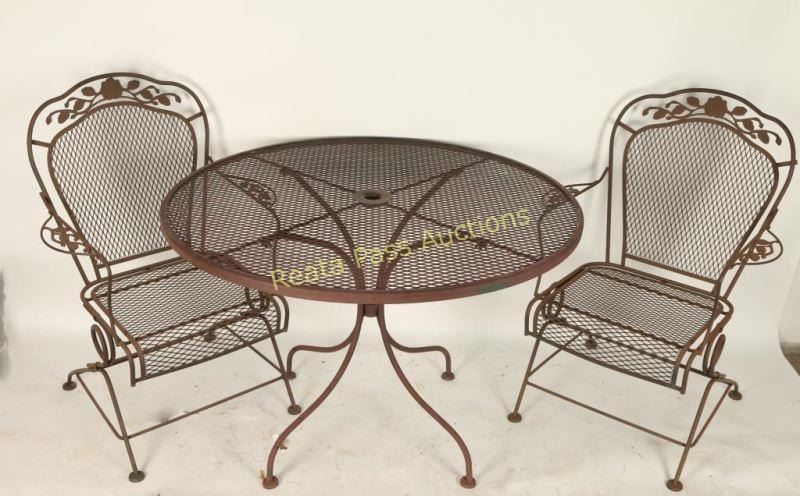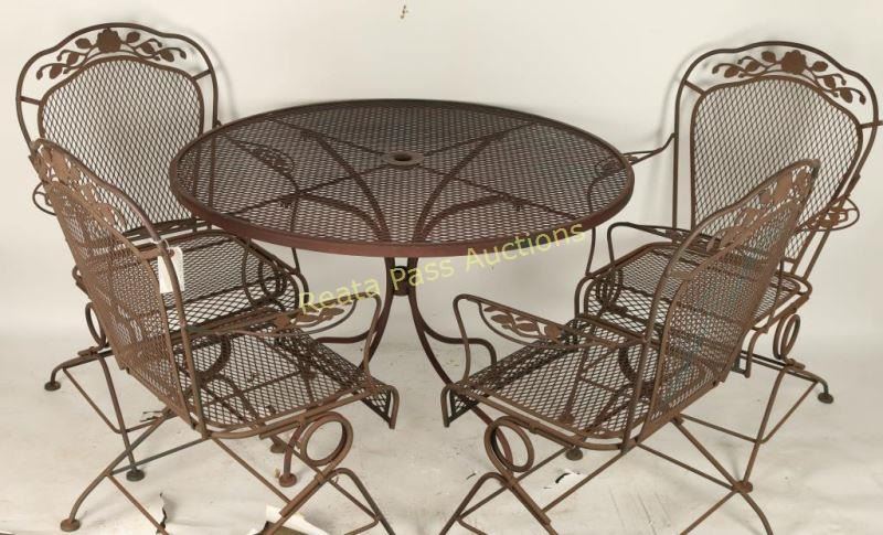Brown metal finish with 4 floral style captain's chairs. One of the chairs metal back needs to be resoldered at decoration. Includes a fiberglass faux tile top. Table measures 48"dia. x 29"h and chairs are 26 1/2"l x 37 1/2"h x 19"w.