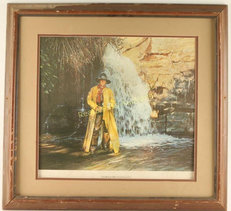 "The Rocky Mountain Legend" in double mat and wood frame. Image measures 19 1/2"x17 3/4". No glass in frame, some small scratches on print and frame has some damage.