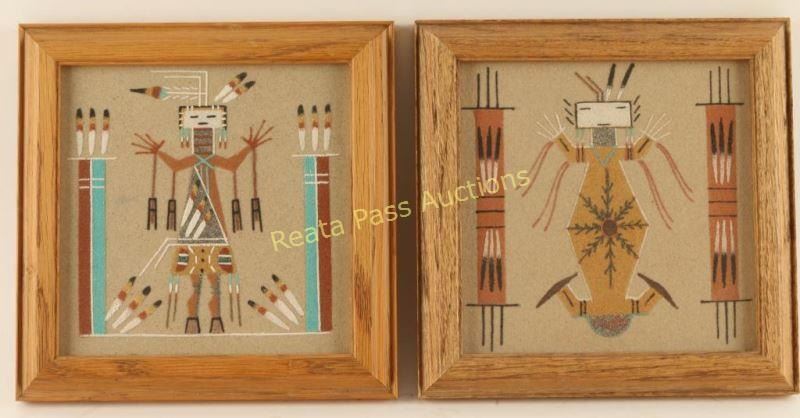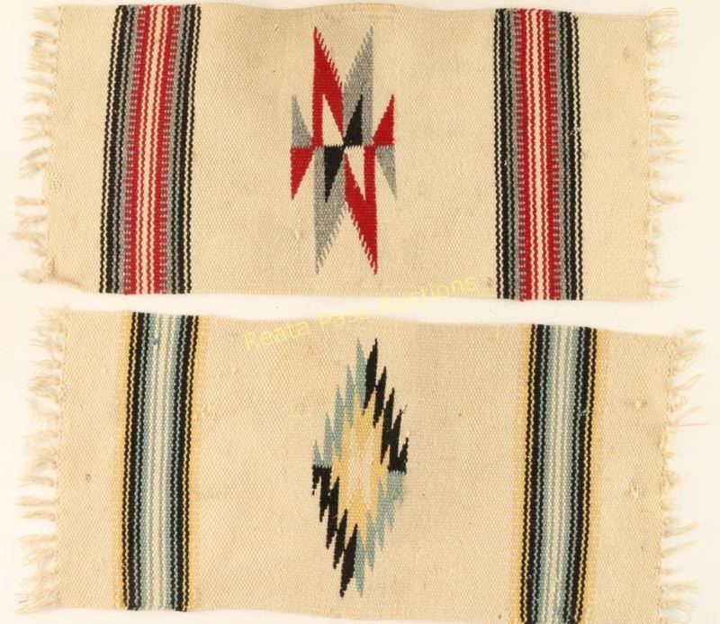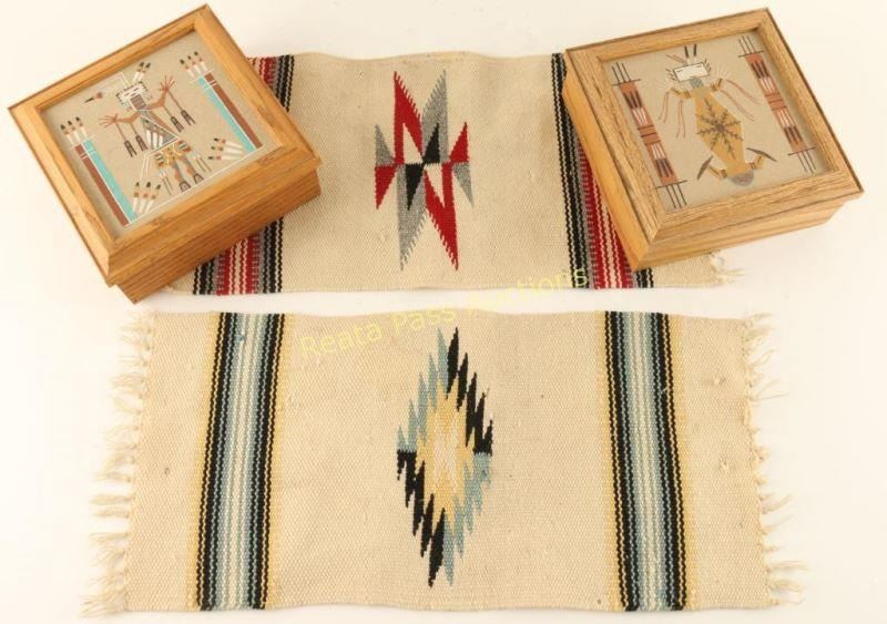 Square oak with inset Kachina design, one by Lester Johnson, and one by D. Keeclah. Includes two small Native American runners.